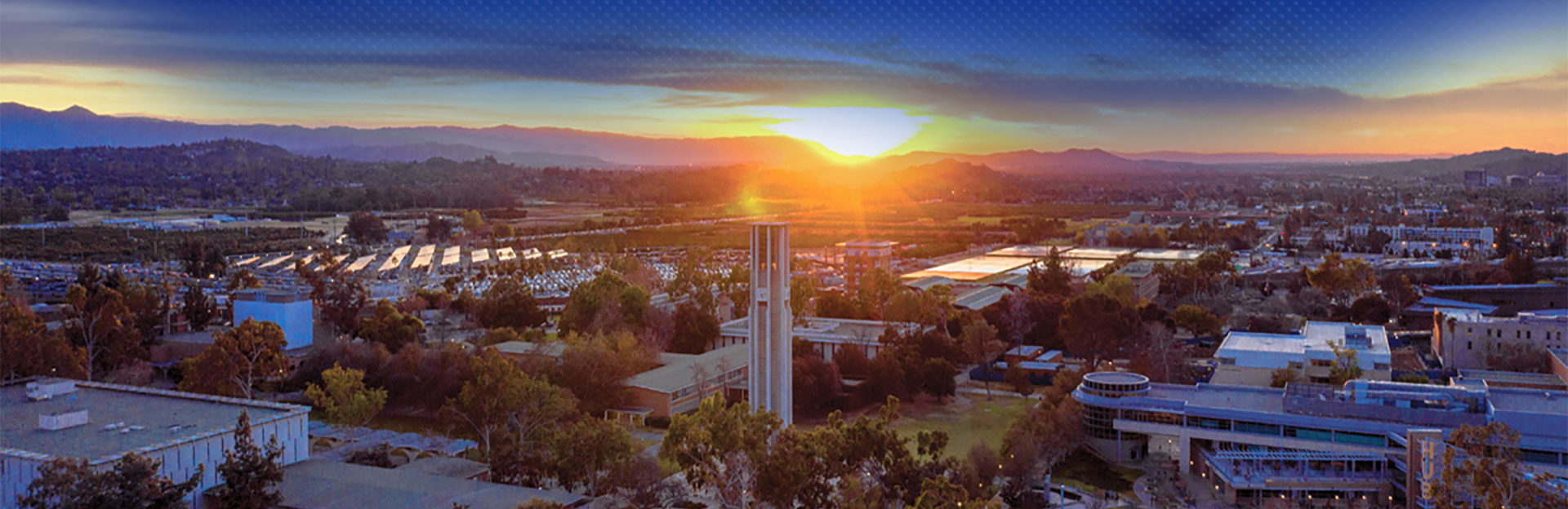 Aerial view of campus and sunset 624px