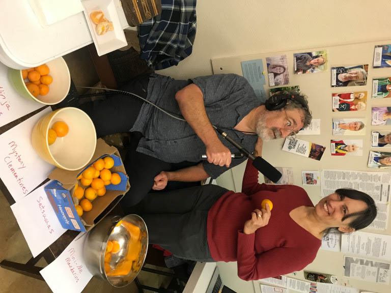 Marketplace reporter Mitchell Hartman offers a tangerine taste test to a participant at a holiday potluck
