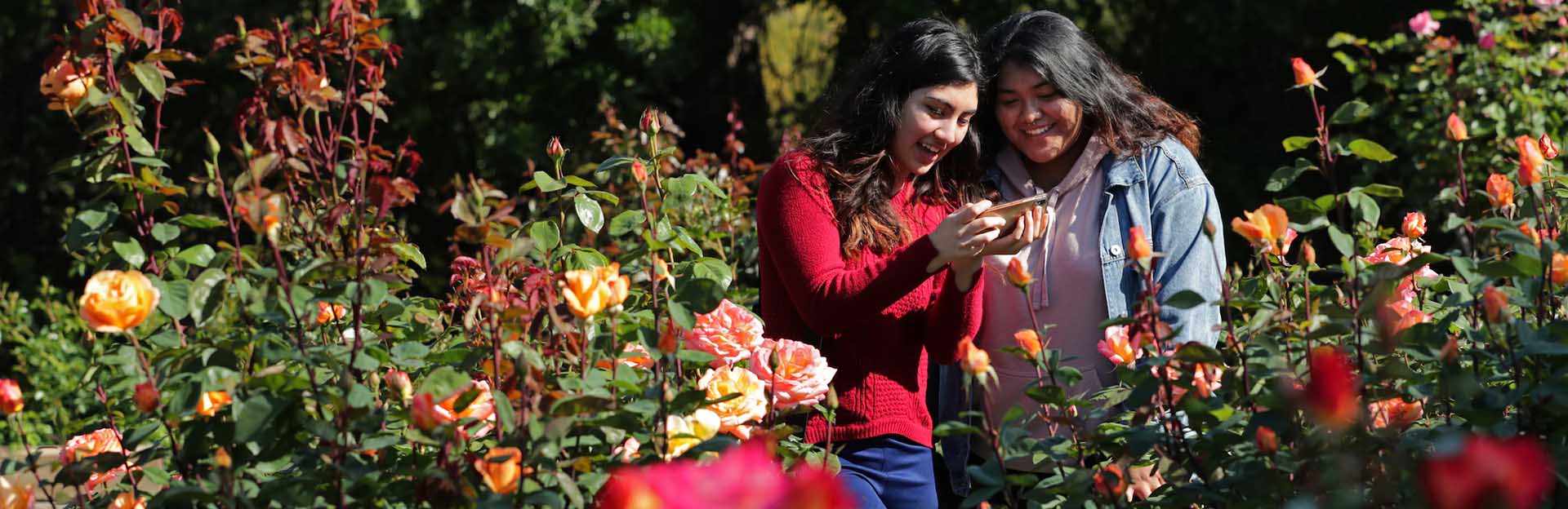 UCR Botanic Gardens, two students in the Rose Garden