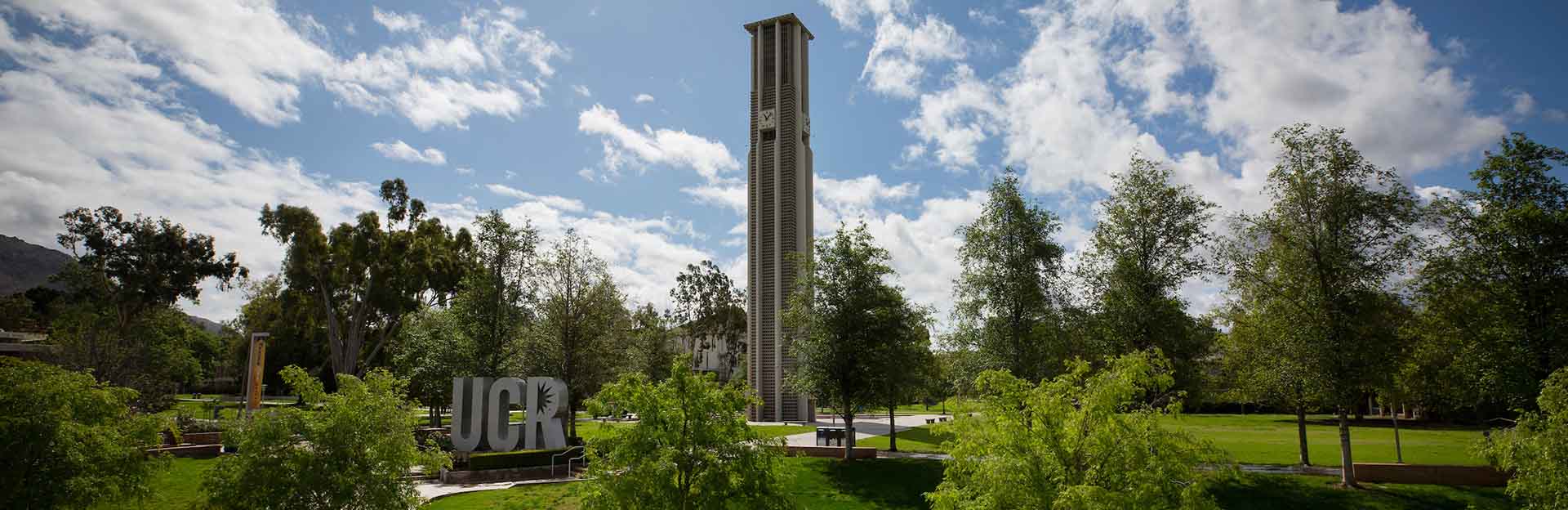 UCR campus with bell tower and sign
