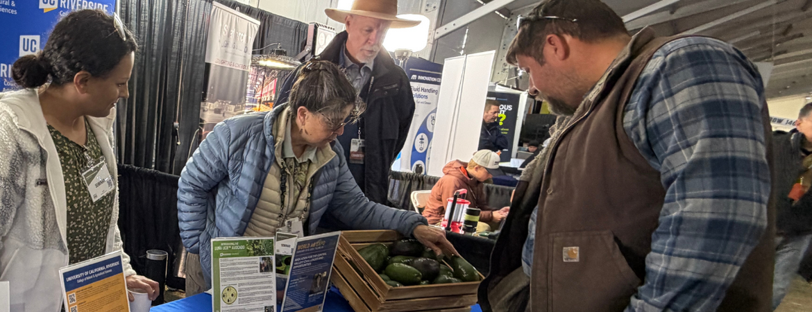 New this year, CNAS hosted a booth in the expo’s pavilion, creating a highly visible space for informal engagement and outreach. A highlight of the exhibit was a display of UCR’s collection of avocado varieties grown at the UC ANR South Coast Research and Extension Center in Irvine, which attracted strong interest from attendees. Visitors also explored citrus offerings — including Tangos and Washington navels — from the Lindcove Research and Extension Center. The Tango mandarin, a widely grown and commercially successful variety — marketed to consumers under brand names such as Cuties® and Halos® — was originally developed through years of citrus breeding research at UCR and released to growers in 2006, illustrating the university’s long-standing impact on the citrus industry. Conversations ranged from backyard tree care to commercial production practices, illustrating the broad reach of CNAS expertise.